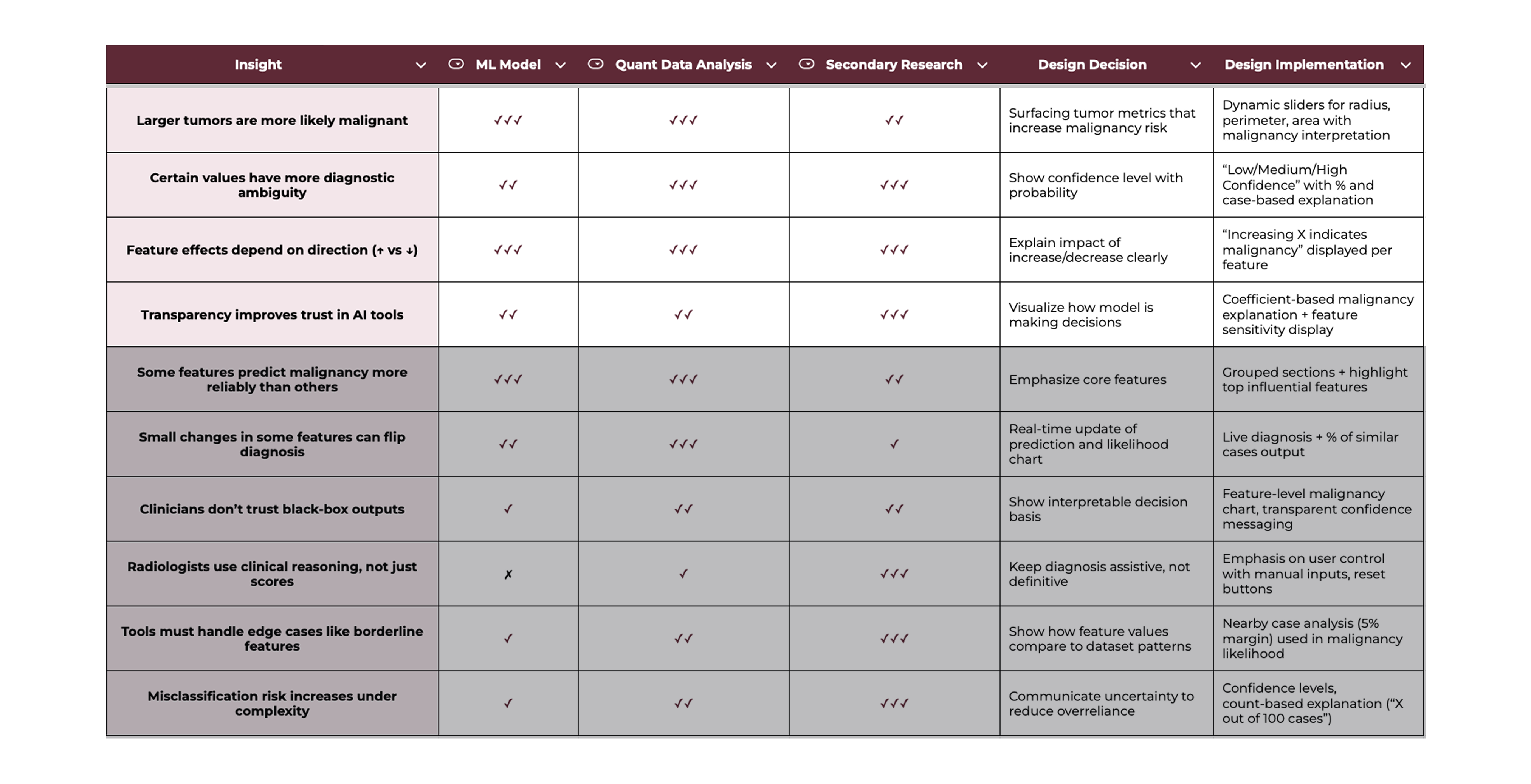 Before designing the interface, I needed to understand how diagnostic decisions break down – in models, in data, and in clinical workflows. I triangulated three methods to create a research-to-design matrix that helped validate patterns across sources and identify high-confidence insights. The matrix surfaced ten core findings that revealed where errors happen, what users actually need, and how AI predictions can be made more interpretable. These insights became the foundation for every UI decision that followed.